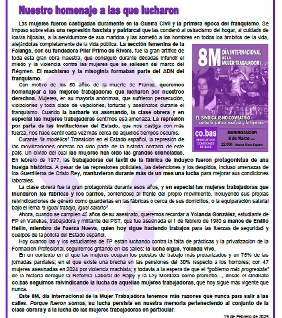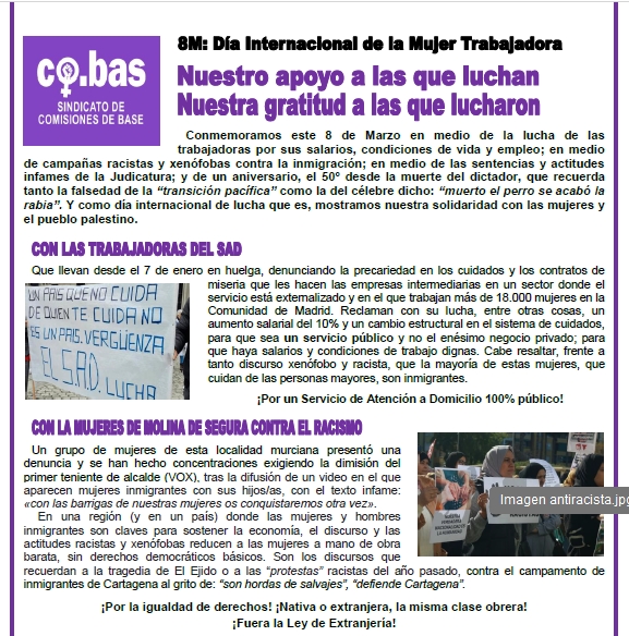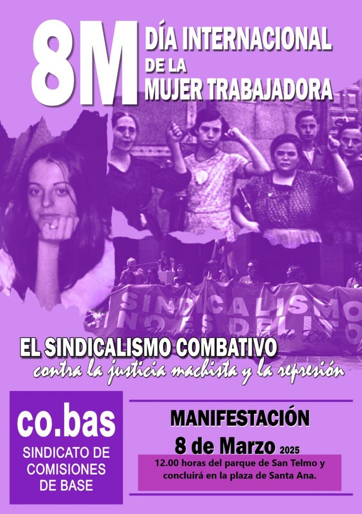 INFORMA CO.BAS – «8M DÍA INTERNACIONAL DE LA MUJER TRABAJADORA».»CONTRA LA JUSTICIA MACHISTA Y LA REPRESIÓN». (Manifestación Las Palmas de G.C. 12:00 Horas Salida Parque San Telmo hasta Plaza Santa Ana).