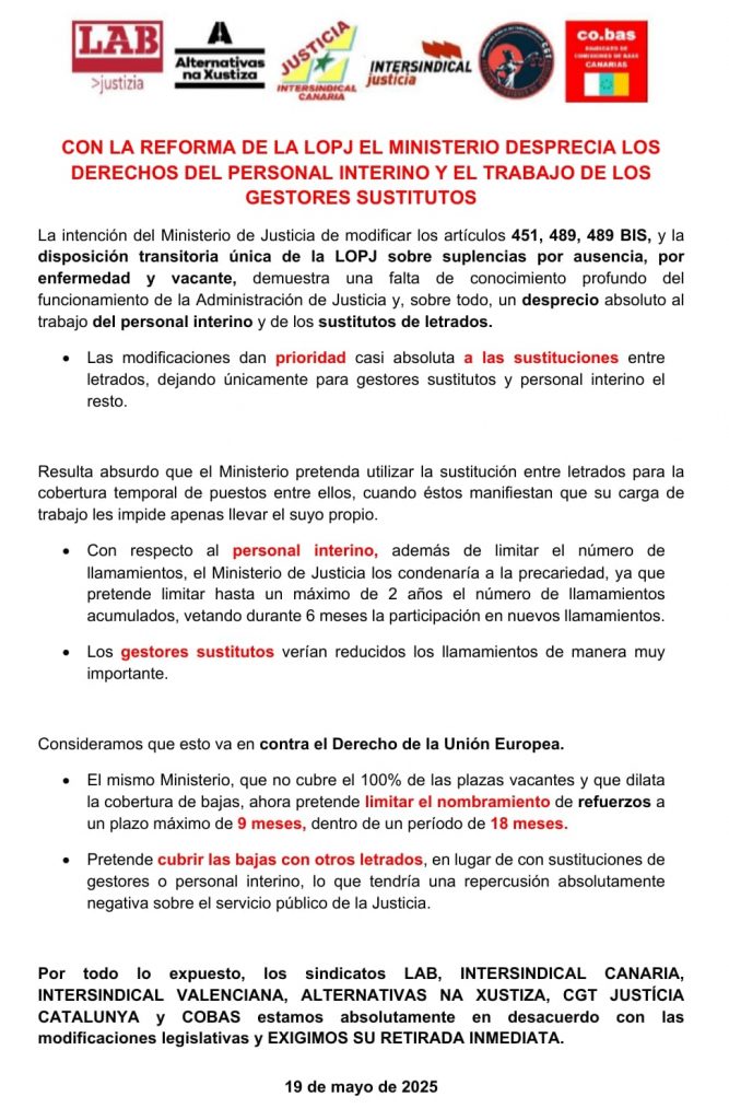 COMUNICADO CONJUNTO SINDICATOS ALTERNATIVOS: CON LA REFORMA DE LA LOPJ EL MINISTERIO DESPRECIA LOS DERECHOS DEL PERSONAL INTERINO Y EL TRABAJO DE LOS GESTORES SUSTITUTOS.