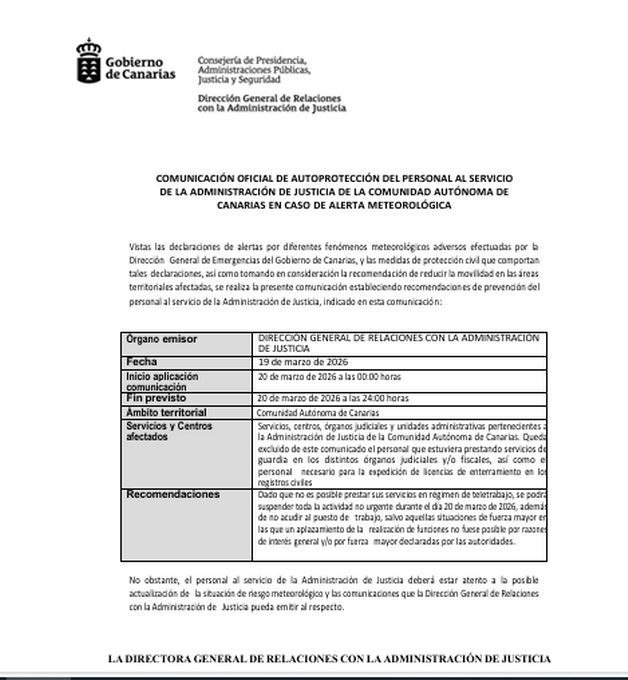 Comunicación Oficial de autoprotección del personal al servicio de la Administración de Justicia en Canarias por alerta meteorológica establecida para el 20/03/2026